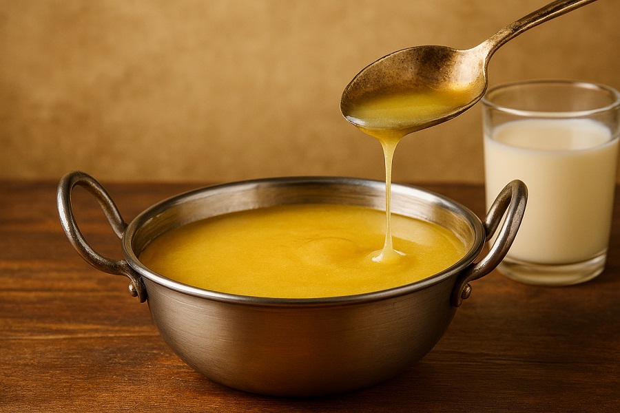 Ghee Health Benefits-आयुर्वेद और आधुनिक विज्ञान दोनों ही सुबह खाली पेट थोड़ी मात्रा में घी के सेवन को लाभकारी मानते हैं। विशेषज्ञों का कहना है कि घी पाचन को बेहतर बनाता है और शरीर को पूरे दिन हल्का एवं ऊर्जावान महसूस कराता है। पोषण विशेषज्ञों के अनुसार, घी में मौजूद ब्यूटिरिक एसिड आंतों की परत को मजबूत करता है, जिससे सूजन कम होती है और लीकी गट जैसी समस्याओं का खतरा घटता है।